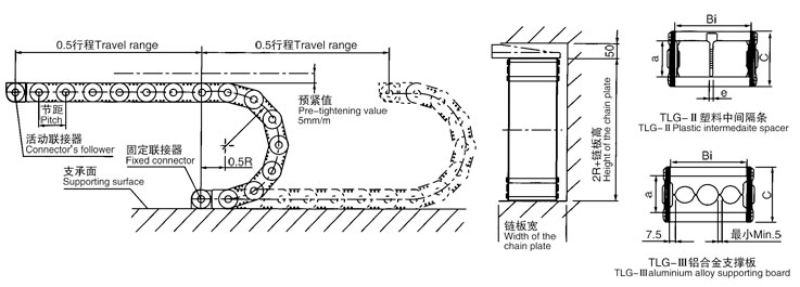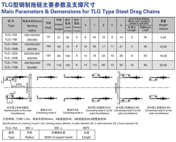 TLG型鋼鋁拖鏈可承載數量多,重量大的電纜及油管,自由懸置(允許不用支承輪)長度大,支撐板可依顧客需要制作,適用于工作母機,移動機械等。其彎曲半徑為50-600mm,鏈板高度為35-150mm,可任意選用。